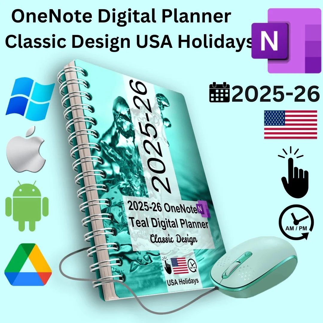 The Teal Digital Planner is a downloadable file compatible with Microsoft OneNote for Windows 10, 11, and OneNote as a part of Office 2021 and Microsoft 365 for Windows users. It also works seamlessly with the native OneNote apps for Android and Apple (iOS) devices. Once you upload the planner's OneNote notebook file to your OneDrive cloud account, you can access it from any device—Windows, Android, or iOS.