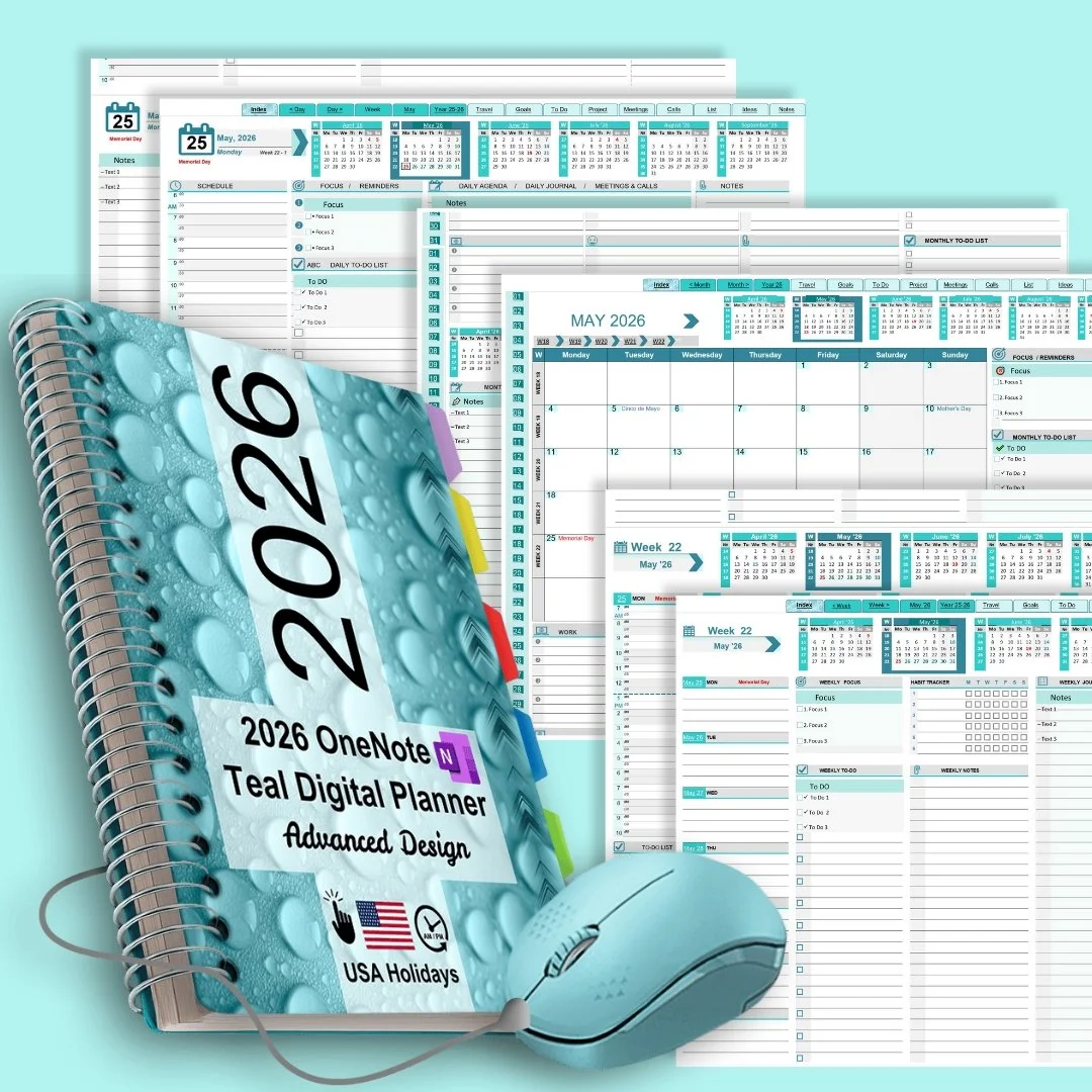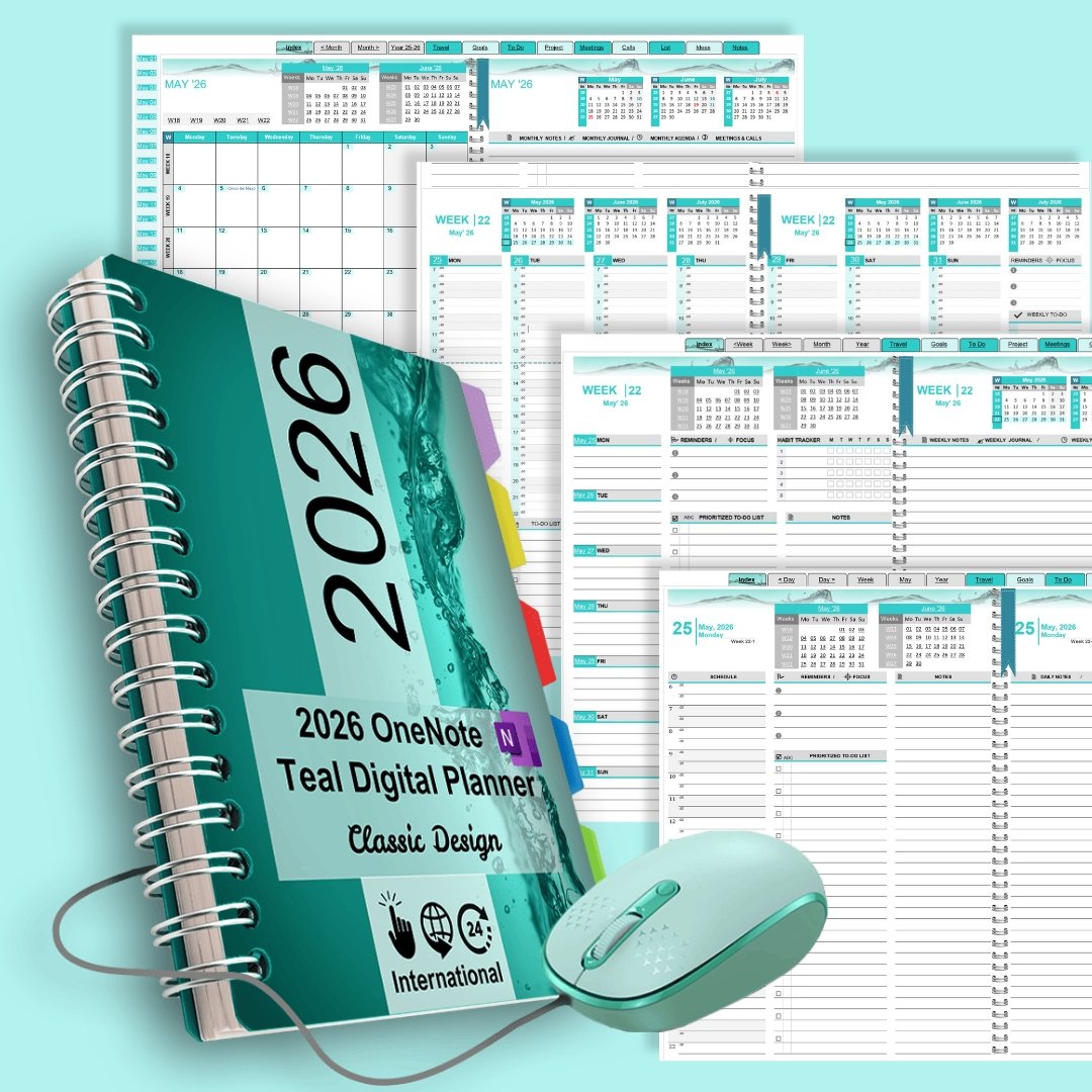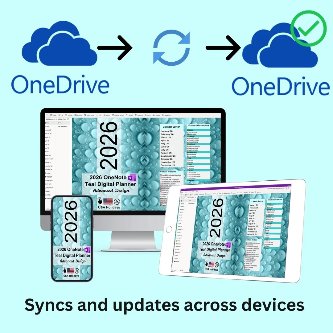 OneNote Teal Digital Planner is a digital, downloadable file compatible with MS OneNote for Windows 10, Windows 11, OneNote 2016/2019/2021, and Microsoft 365, as well as the native OneNote apps for Android and Apple users. Once the planner's OneNote notebook file is uploaded to your Microsoft OneDrive account, it becomes accessible on any mobile device using Windows, Android, or iOS. All changes sync automatically and update across all devices.