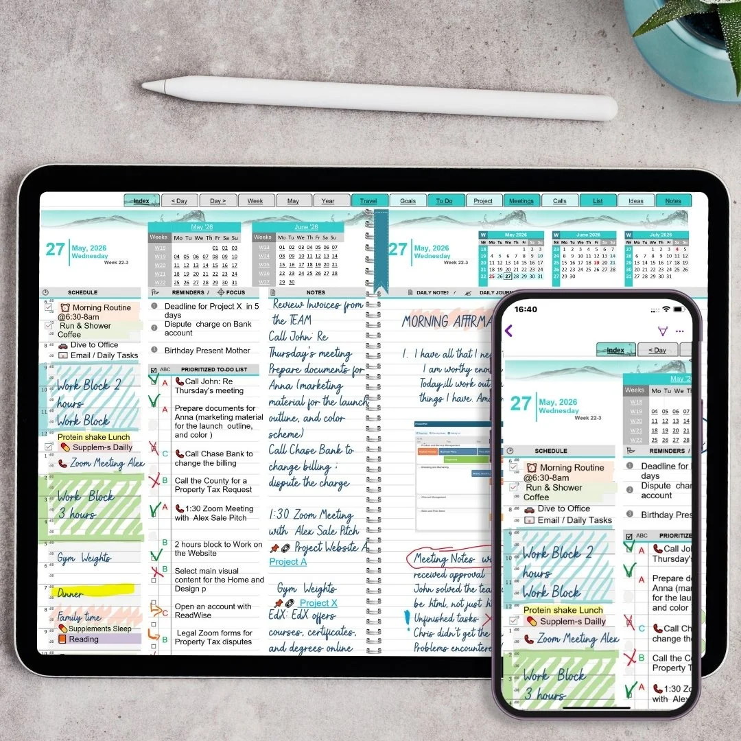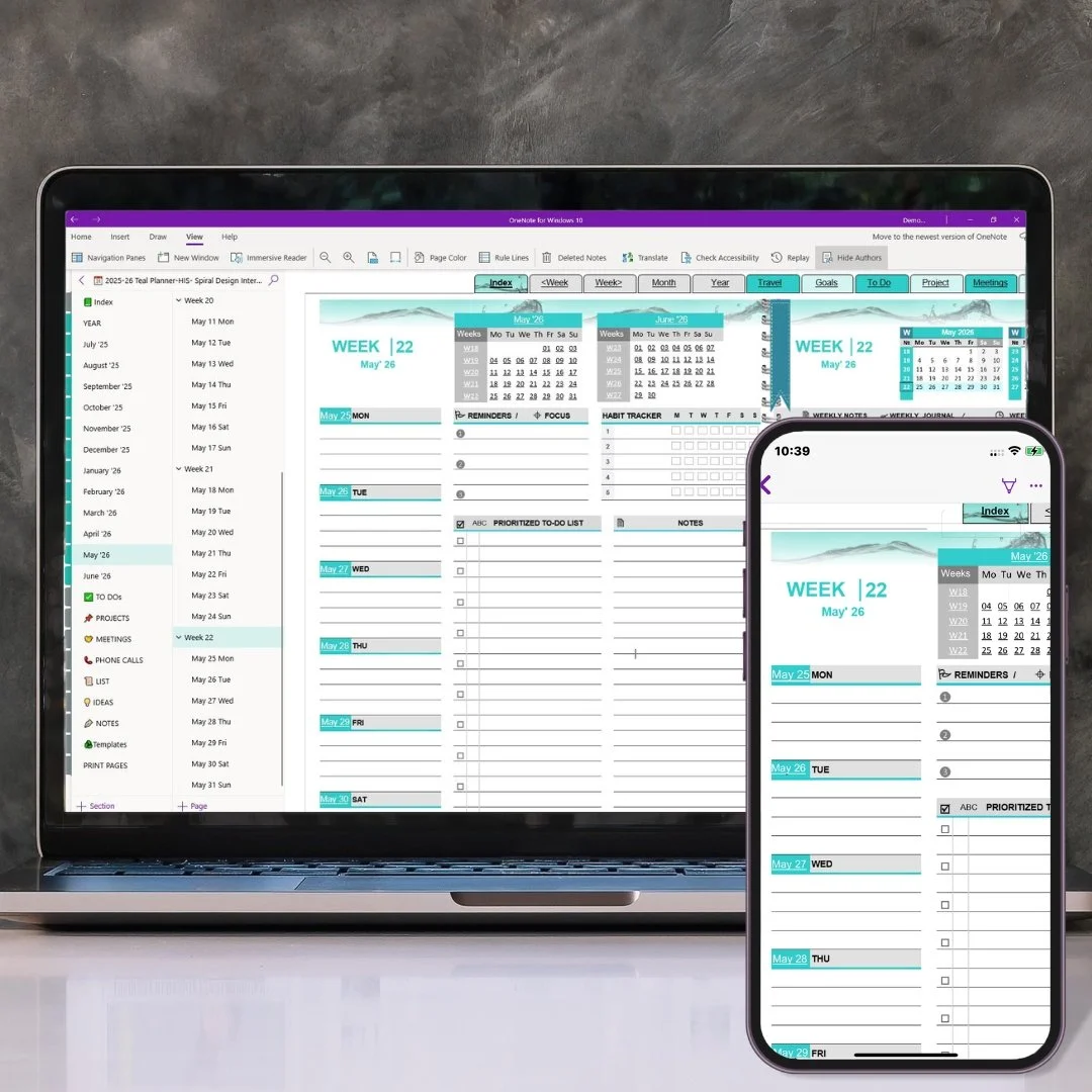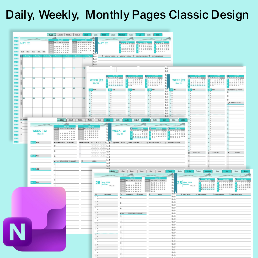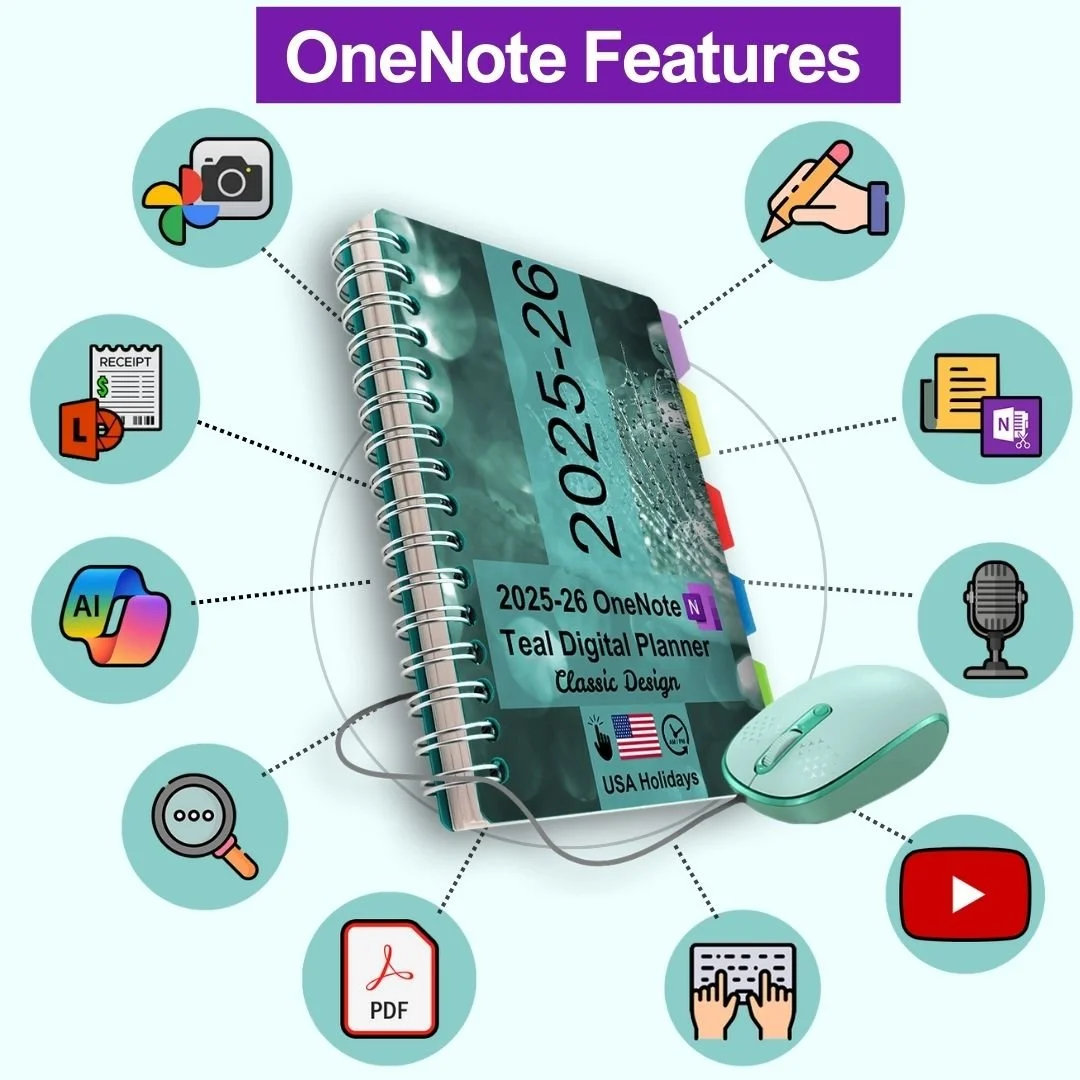 OneNote Teal Digital Planner is a digital, downloadable file compatible with MS OneNote for Windows 10, Windows 11, OneNote 2016/2019/2021, and Microsoft 365, as well as the native OneNote apps for Android and Apple users. Once the planner's OneNote notebook file is uploaded to your Microsoft OneDrive account, it becomes accessible on any mobile device using Windows, Android, or iOS. All changes sync automatically and update across all devices.